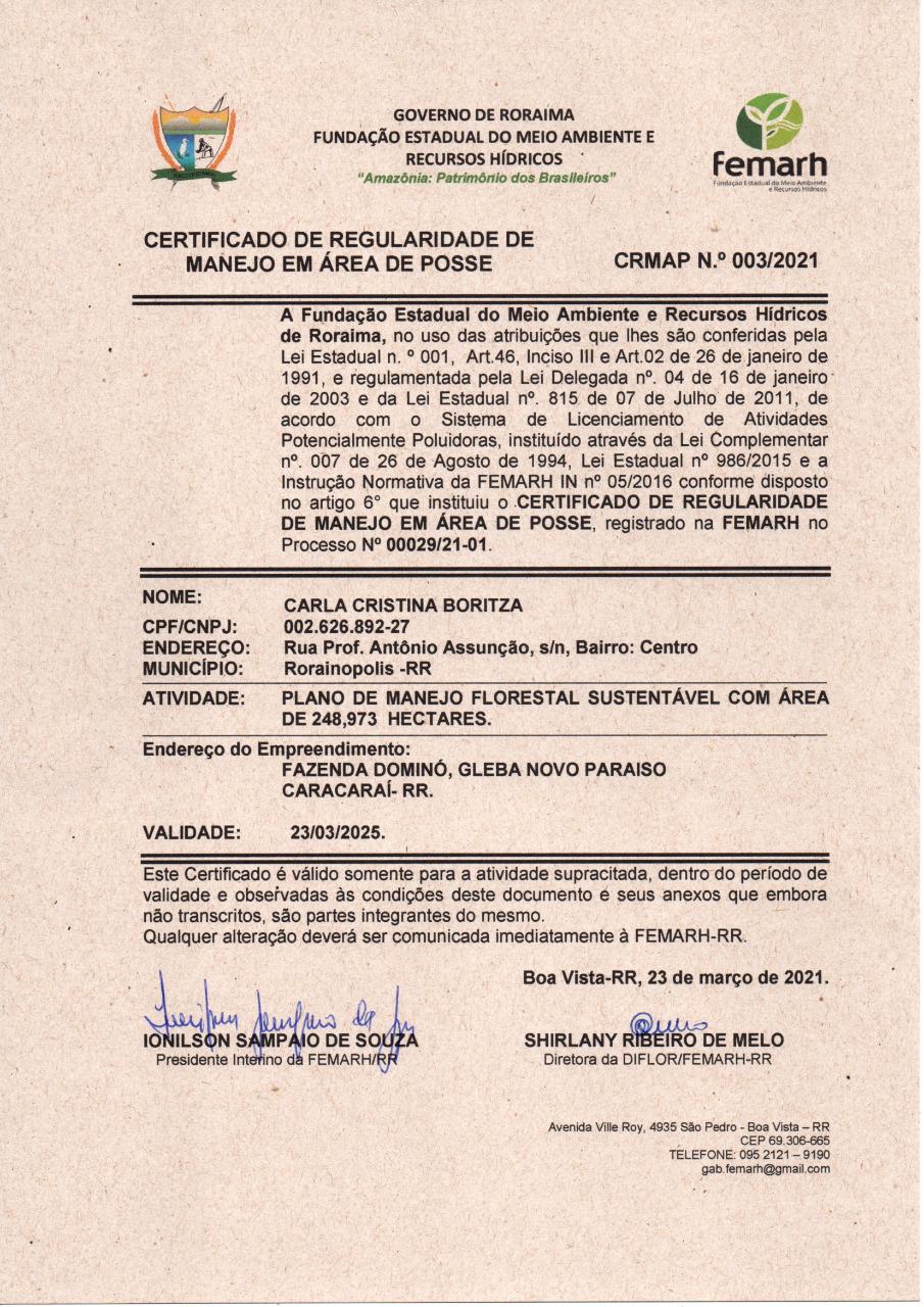 Certificado de Regularidade de Manejo em Área de Posse - CRMAP Nº 003/2021