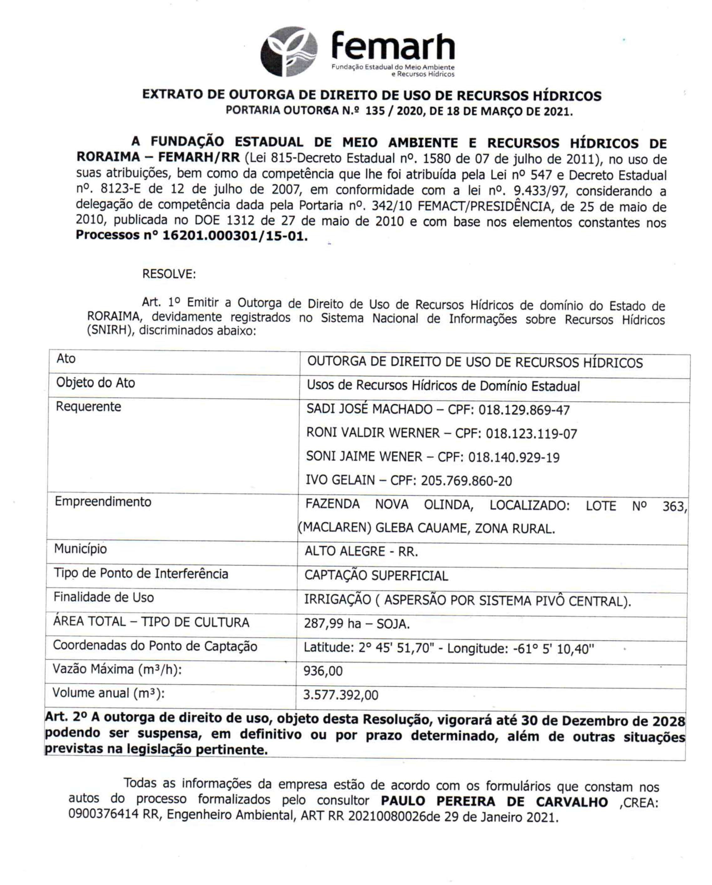 Extrato de Outorga de Direito de Uso dos Recursos Hídricos - Fazenda Nova Olinda