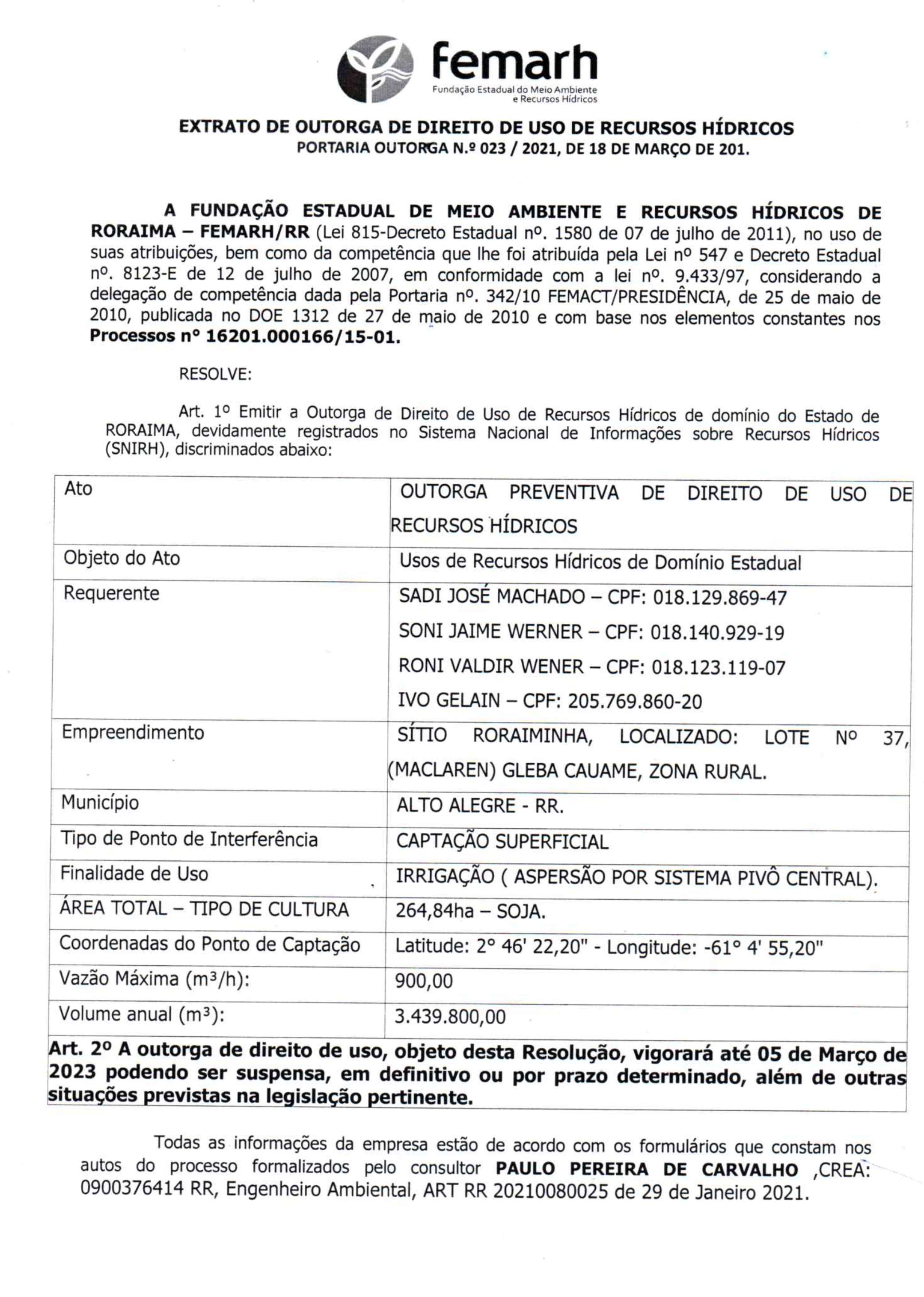 Extrato de Outorga de Direito de Uso dos Recursos Hídricos - Sítio Roraiminha