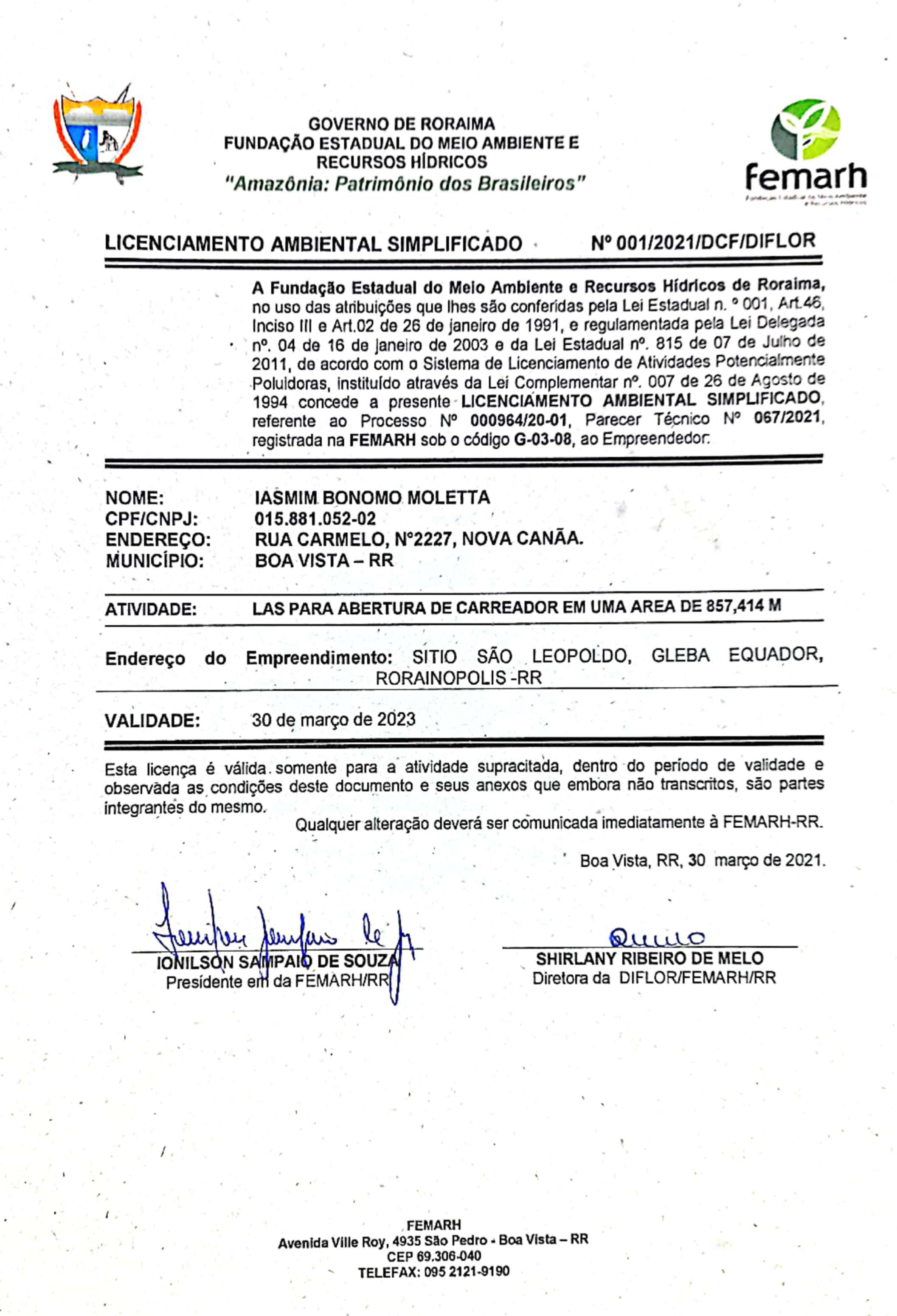Licenciamento Ambiental Simplificado - LAS Nº 001/2021/DCF/DIFLOR