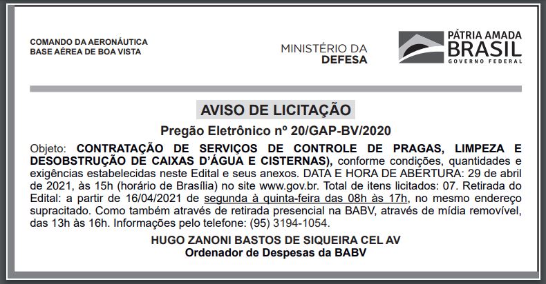 Aviso de Licitação - Pregão Eletrônico nº 020/GAP-BV/2020