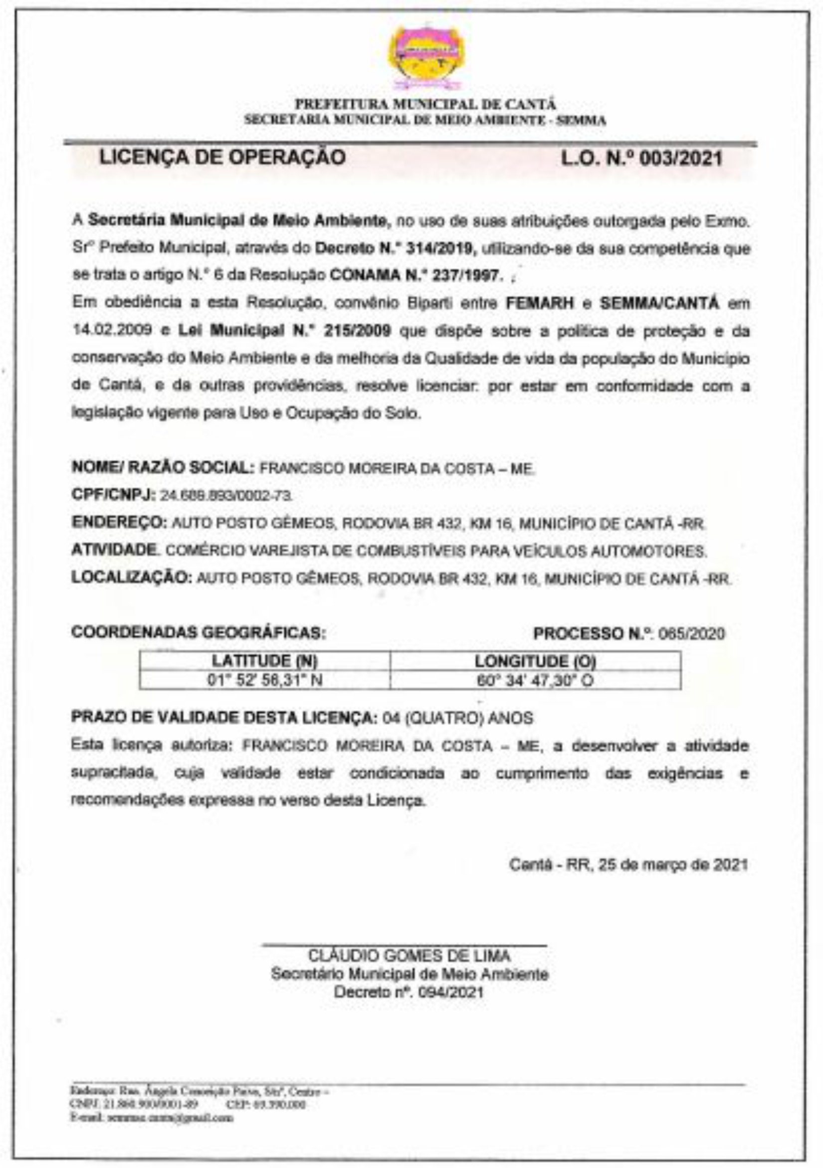Licença de Operação LO Nº 003/2021