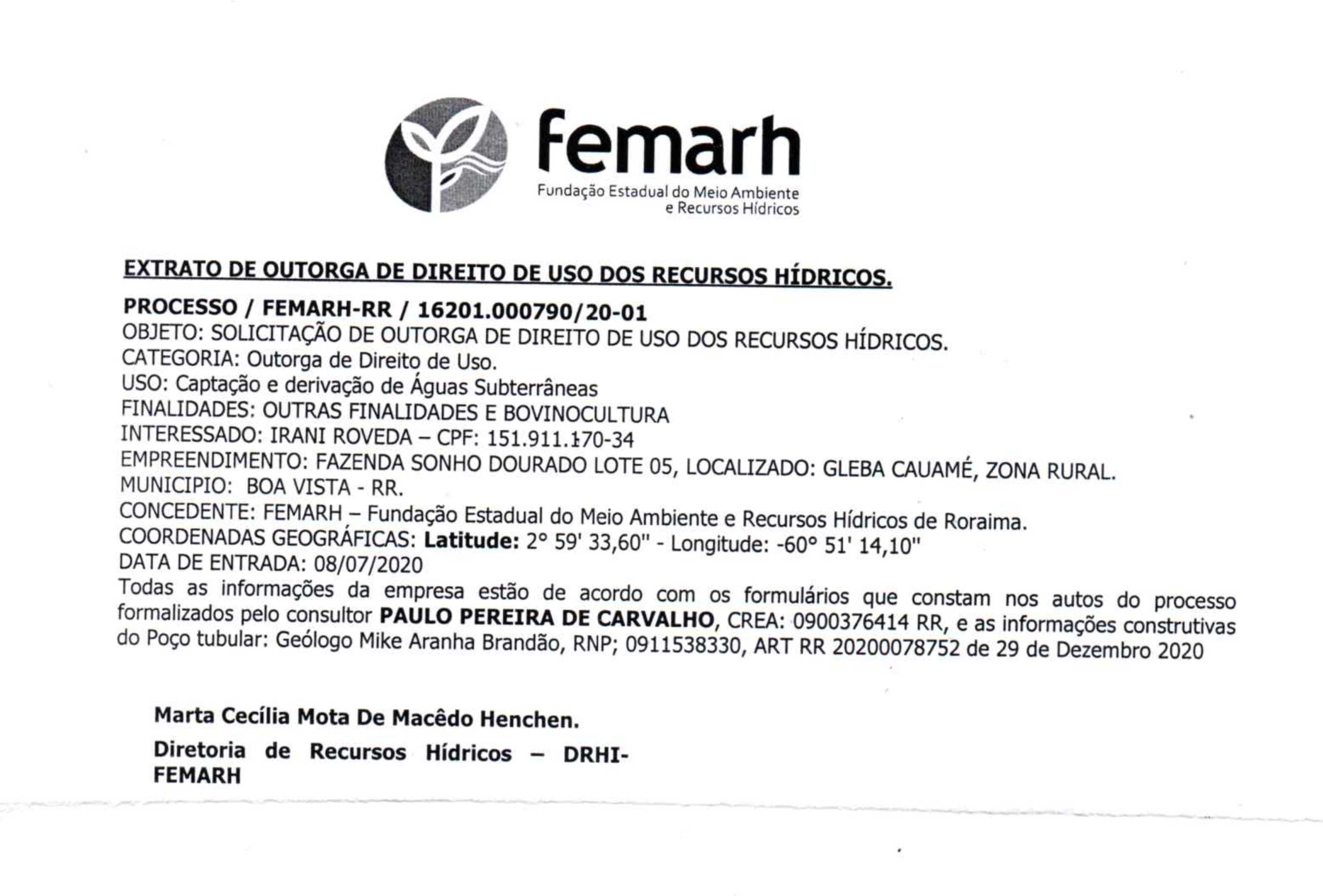 Extrato de Outorga de Direito de Uso dos Recursos Hídricos - Fazenda Sonho Dourado