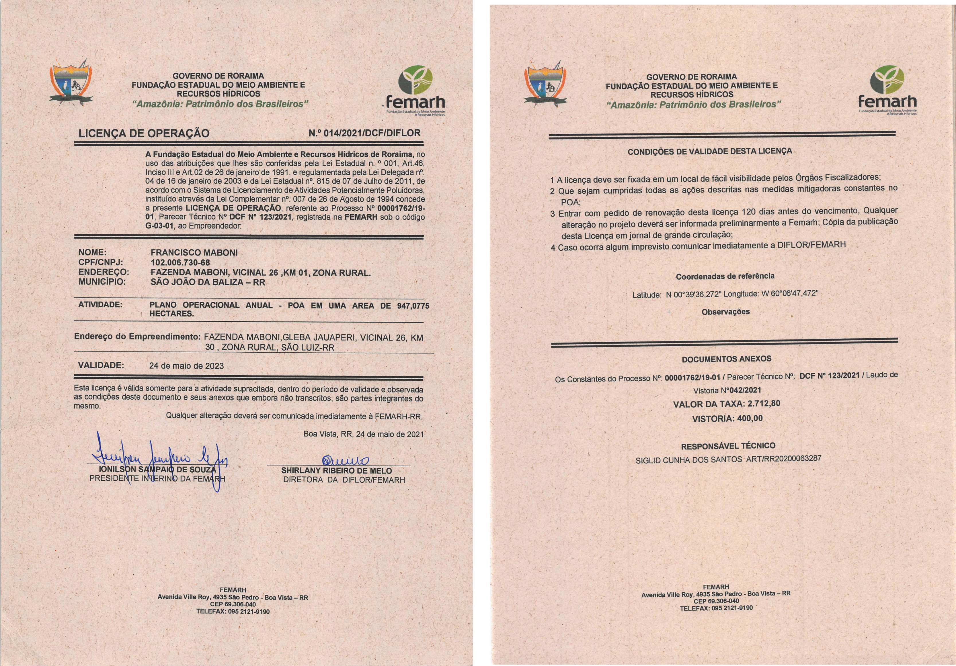 Licença de Operação LO Nº 014/2021/DCF/DIFLOR