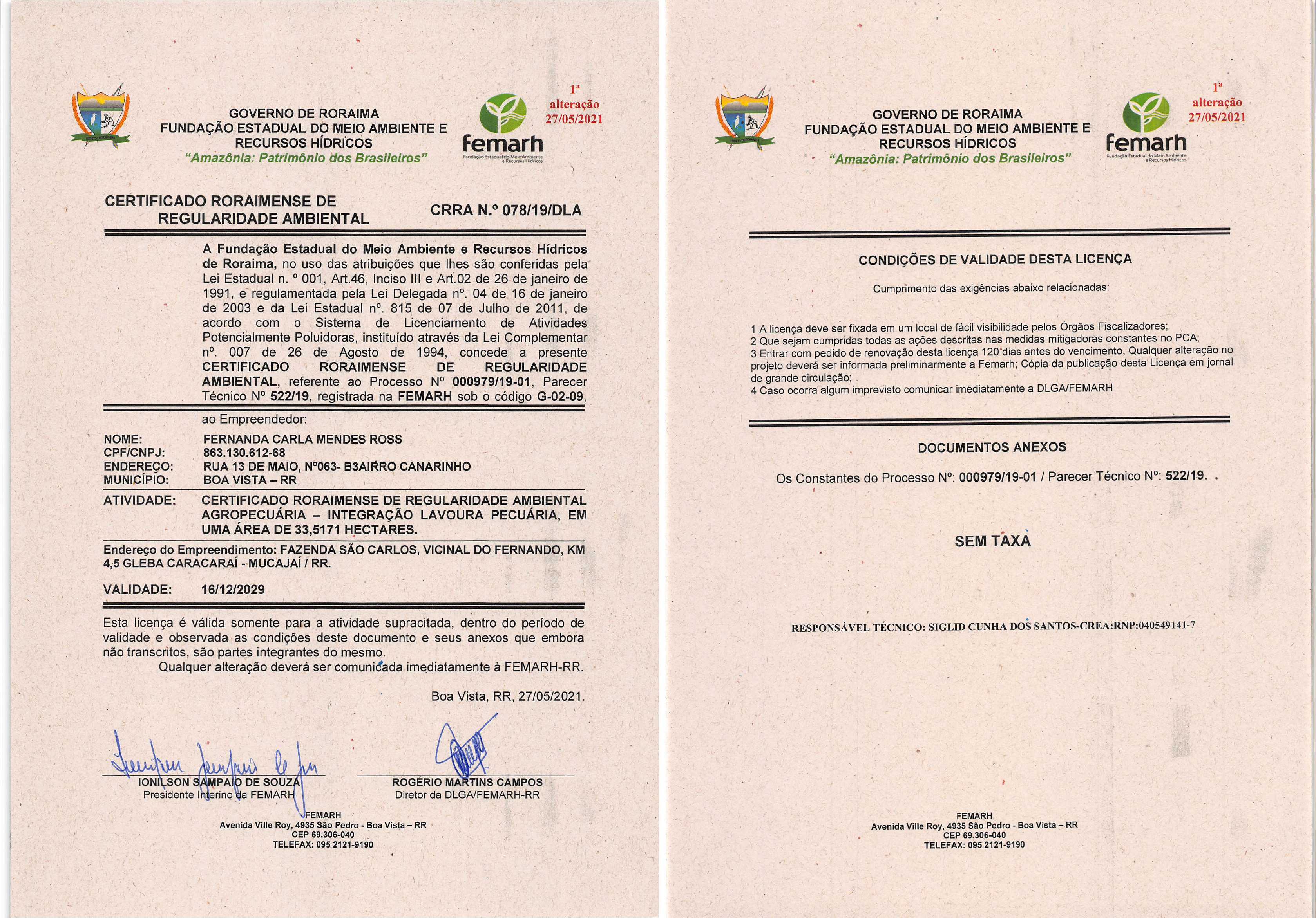 Certificado Roraimense de Regularidade Ambiental - CRRA Nº 078/19/DLA