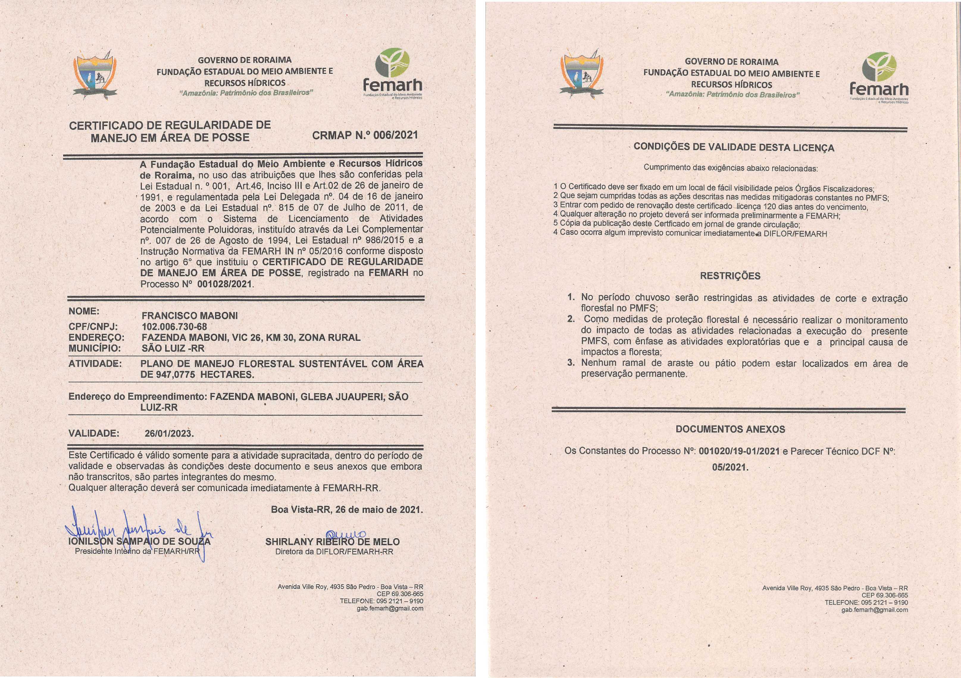 Certificado de Regularidade de Manejo em Área de Posse - CRMAP Nº 006/2021
