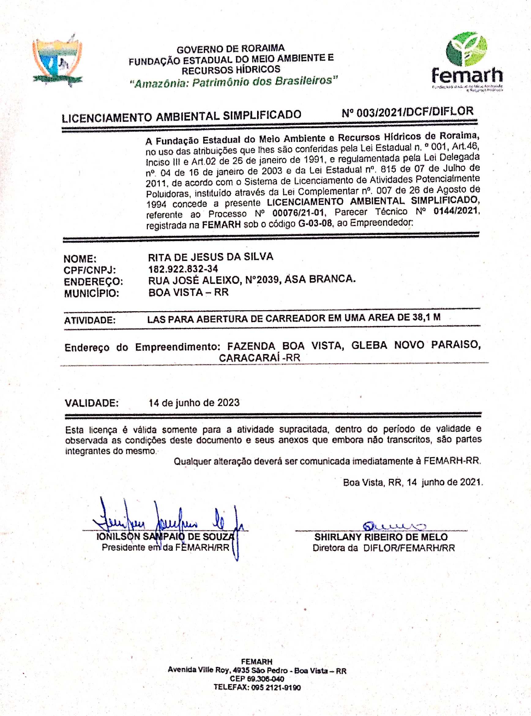 Licenciamento Ambiental Simplificado - LAS Nº 003/2021/DCF/DIFLOR