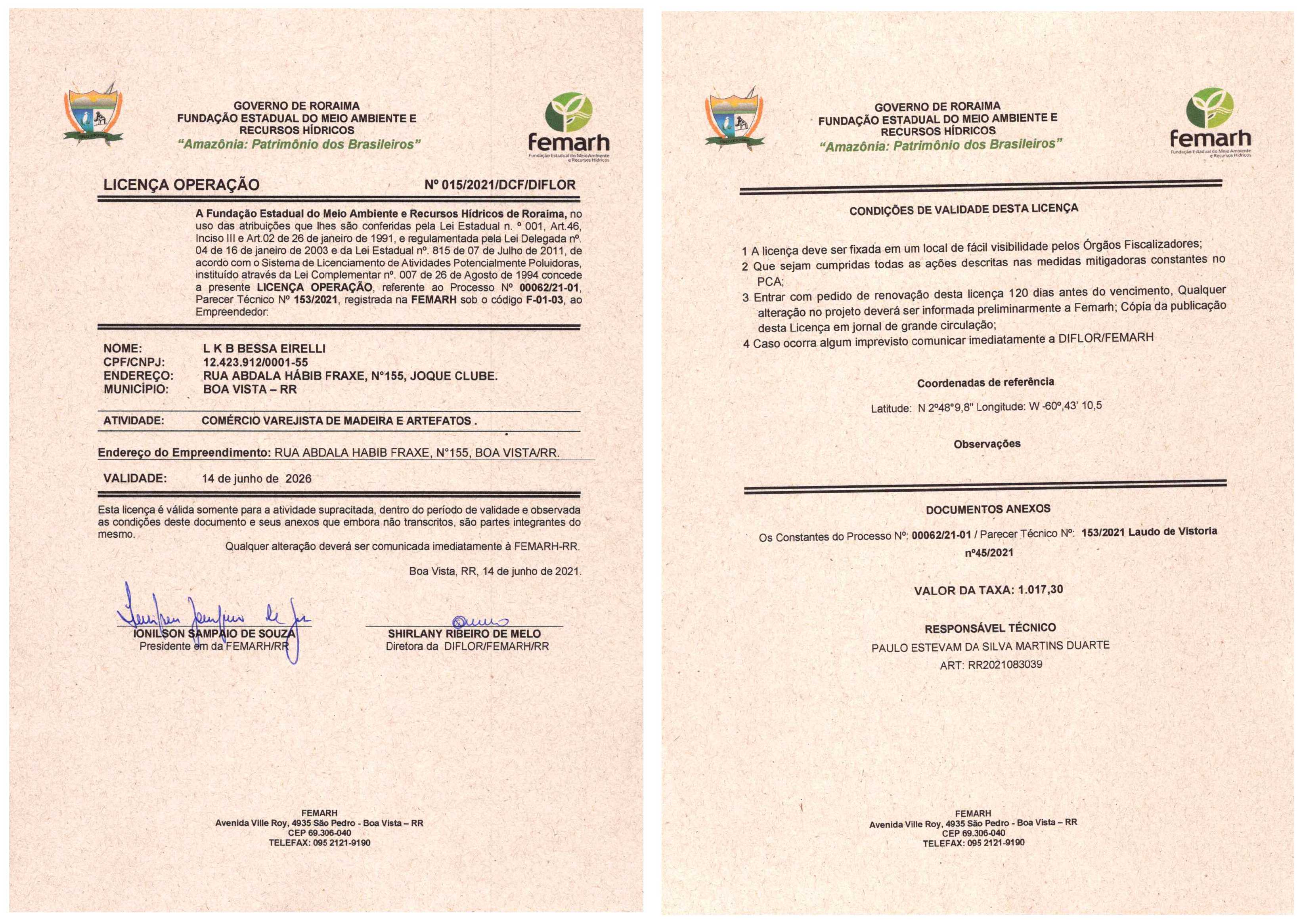 Licença de Operação LO Nº 015/2021/DCF/DIFLOR