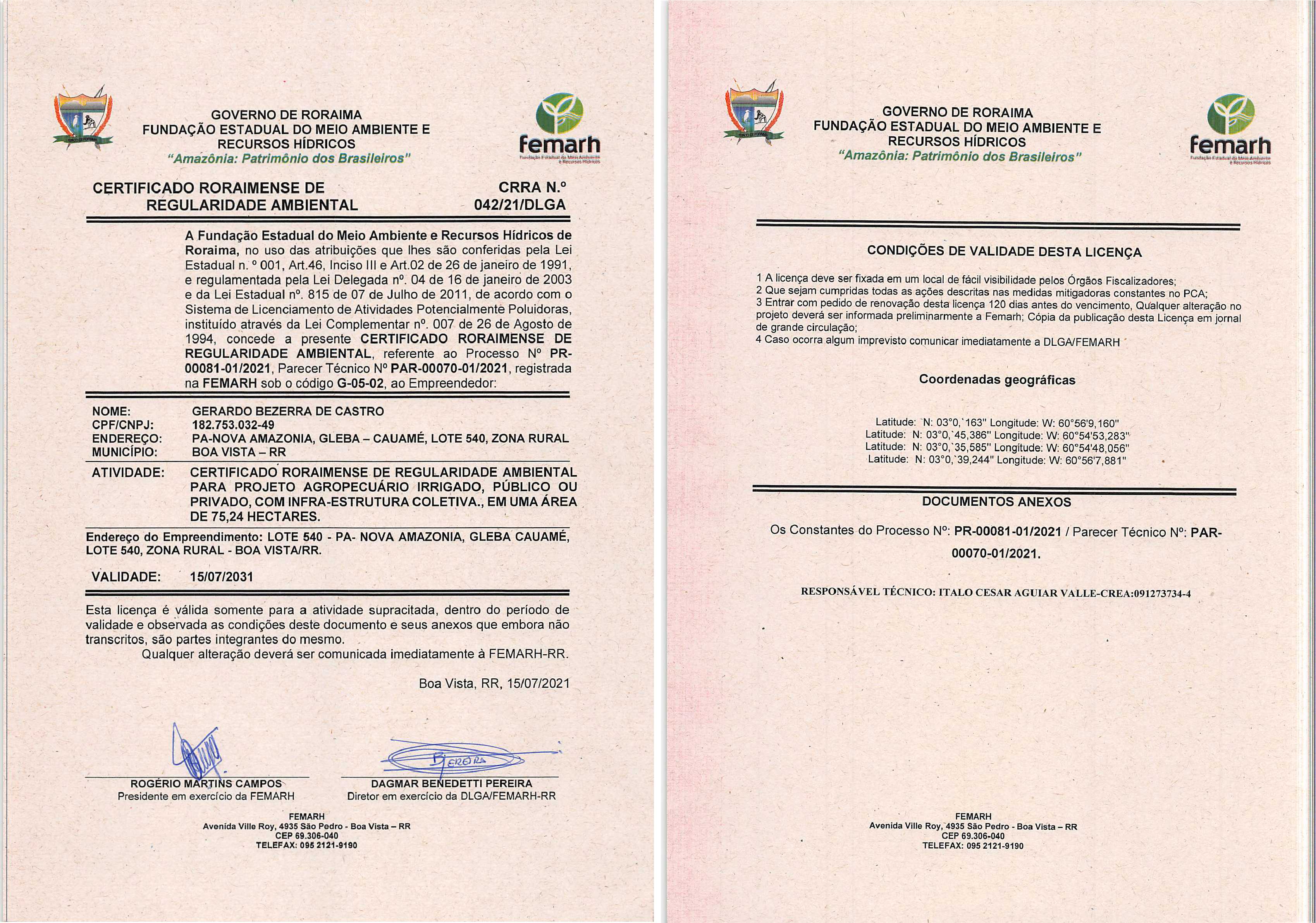 Certificado Roraimense de Regularidade Ambiental - CRRA Nº 042/2021/DLGA
