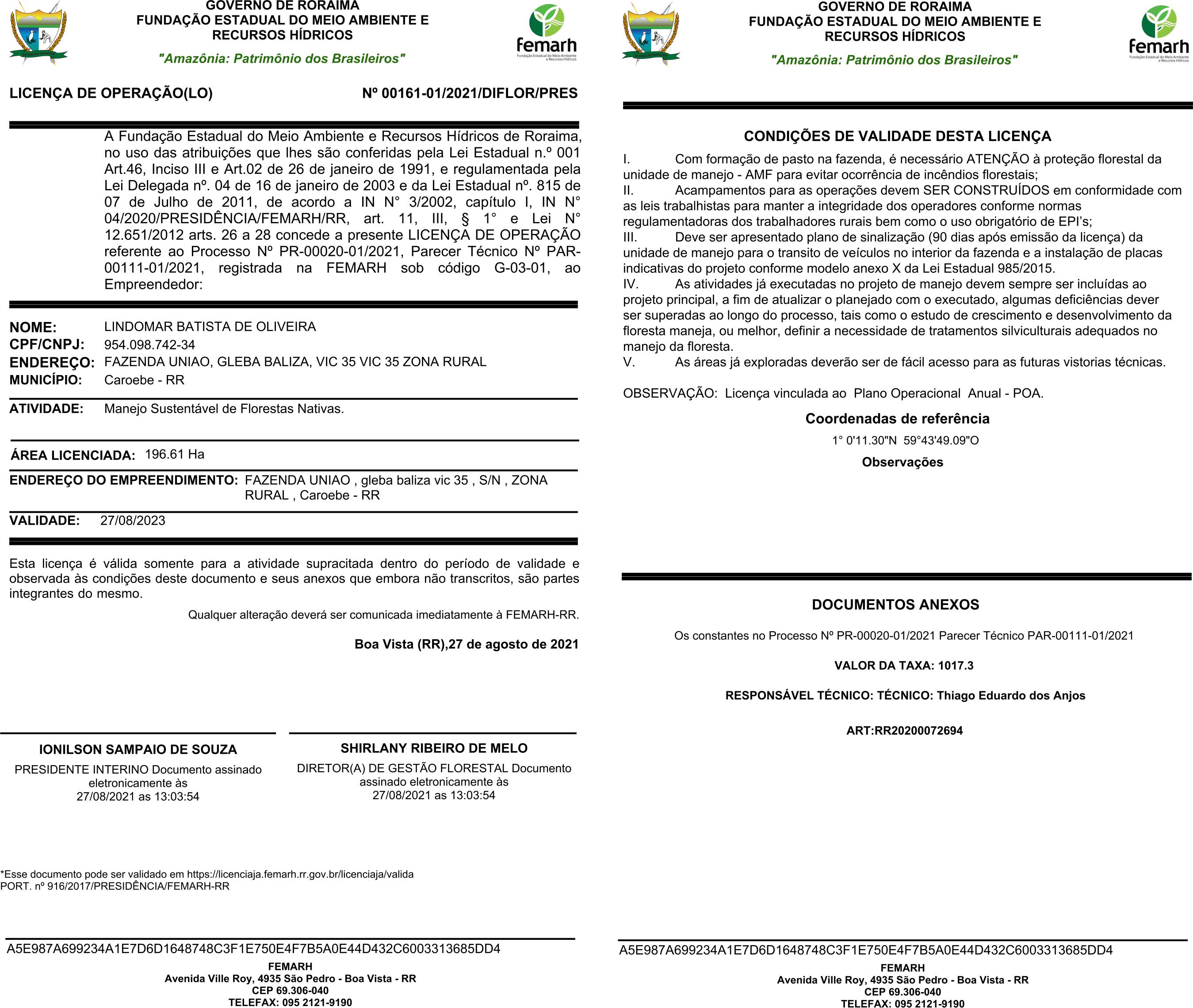 Licença de Operação(LO) Nº 00161/2021/DIFLOR/PRES