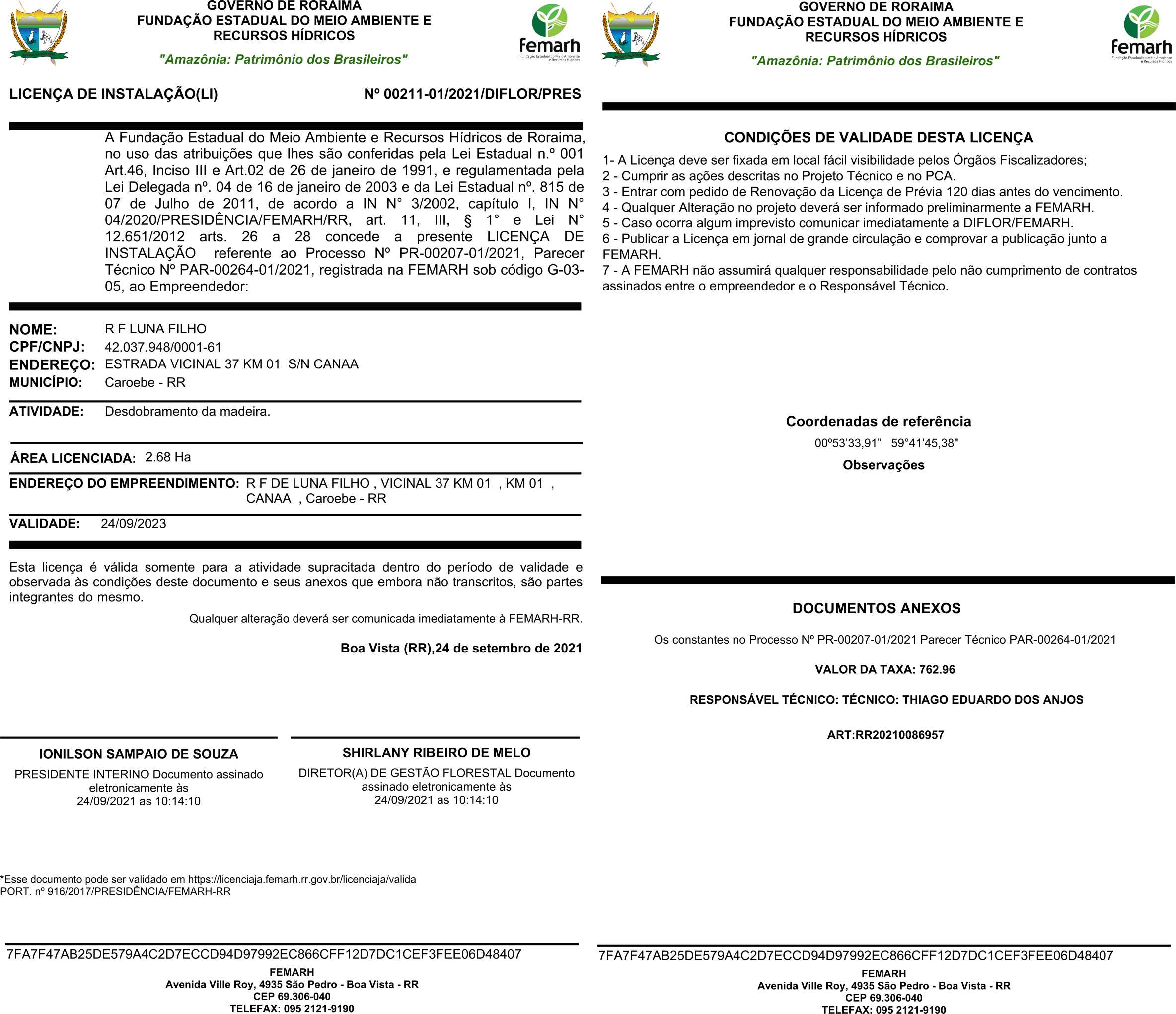 Licença de Instalação (LI) Nº 00211-01/2021/DIFLOR/PRES
