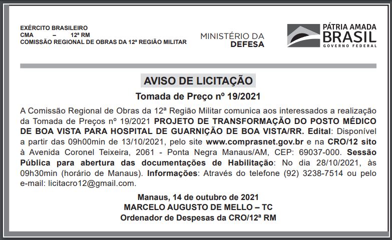EXÉRCITO BRASILEIRO CMA – 12ª RM COMISSÃO REGIONAL DE OBRAS DA 12ª REGIÃO MILITAR - Tomada de Preços nº 019/2021