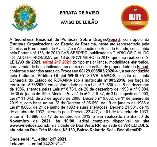 ERRATA DE AVISO DE LEILÃO - Secretaria Nacional de Políticas Sobre Drogas/SENAD
