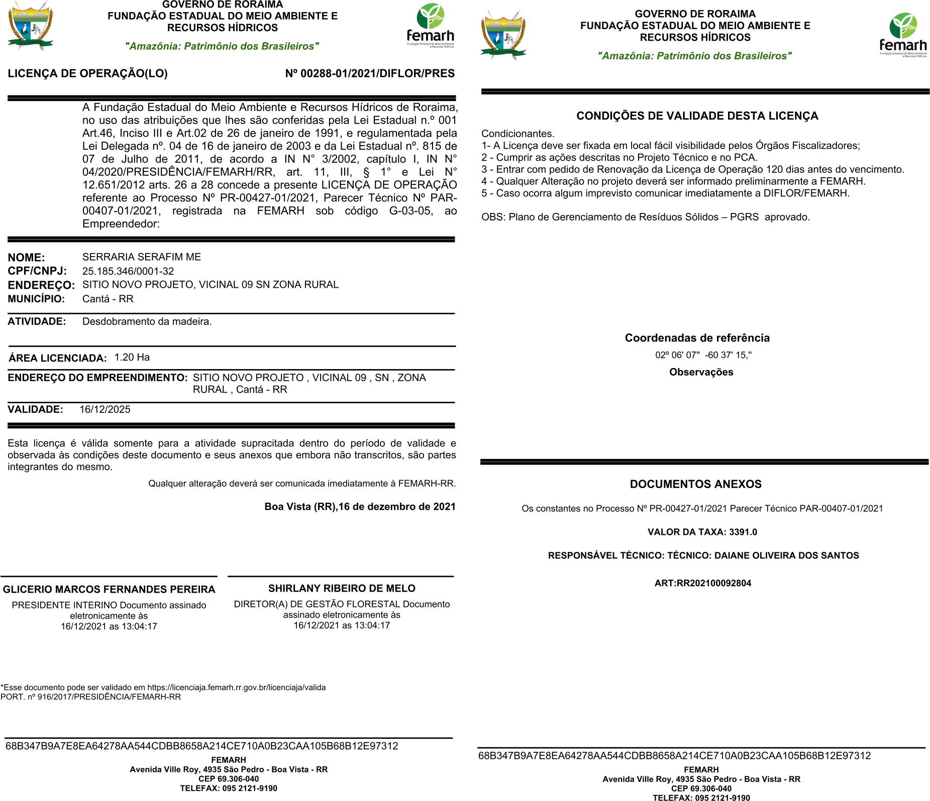 Licença de Operação(LO) Nº 00288-01/2021/DIFLOR/PRES