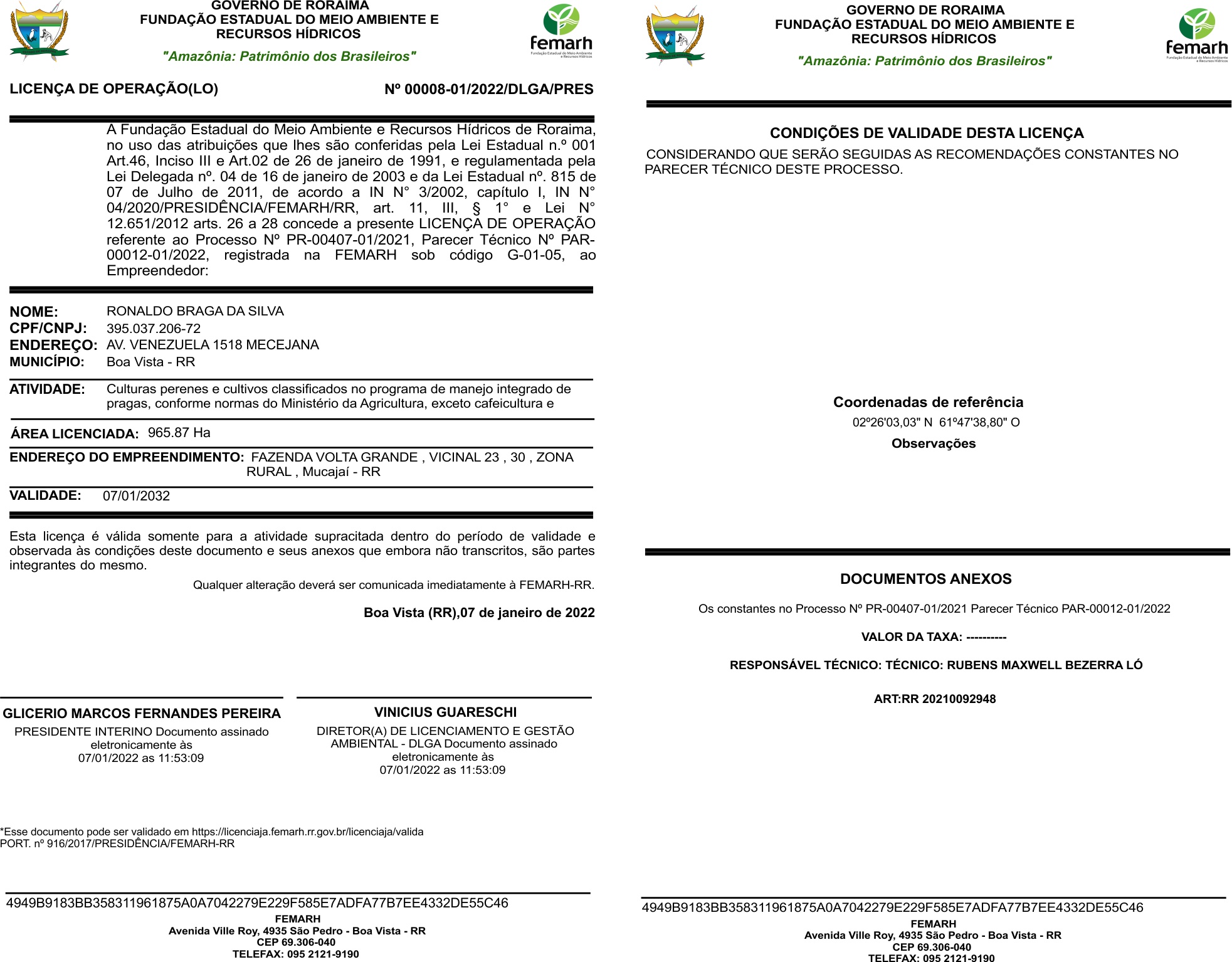 Licença de Operação (LO) Nº 00008-01/2022/DLGA/PRES