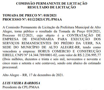 AVISO DE LICITAÇÃO - Tomada de Preços 018/2021