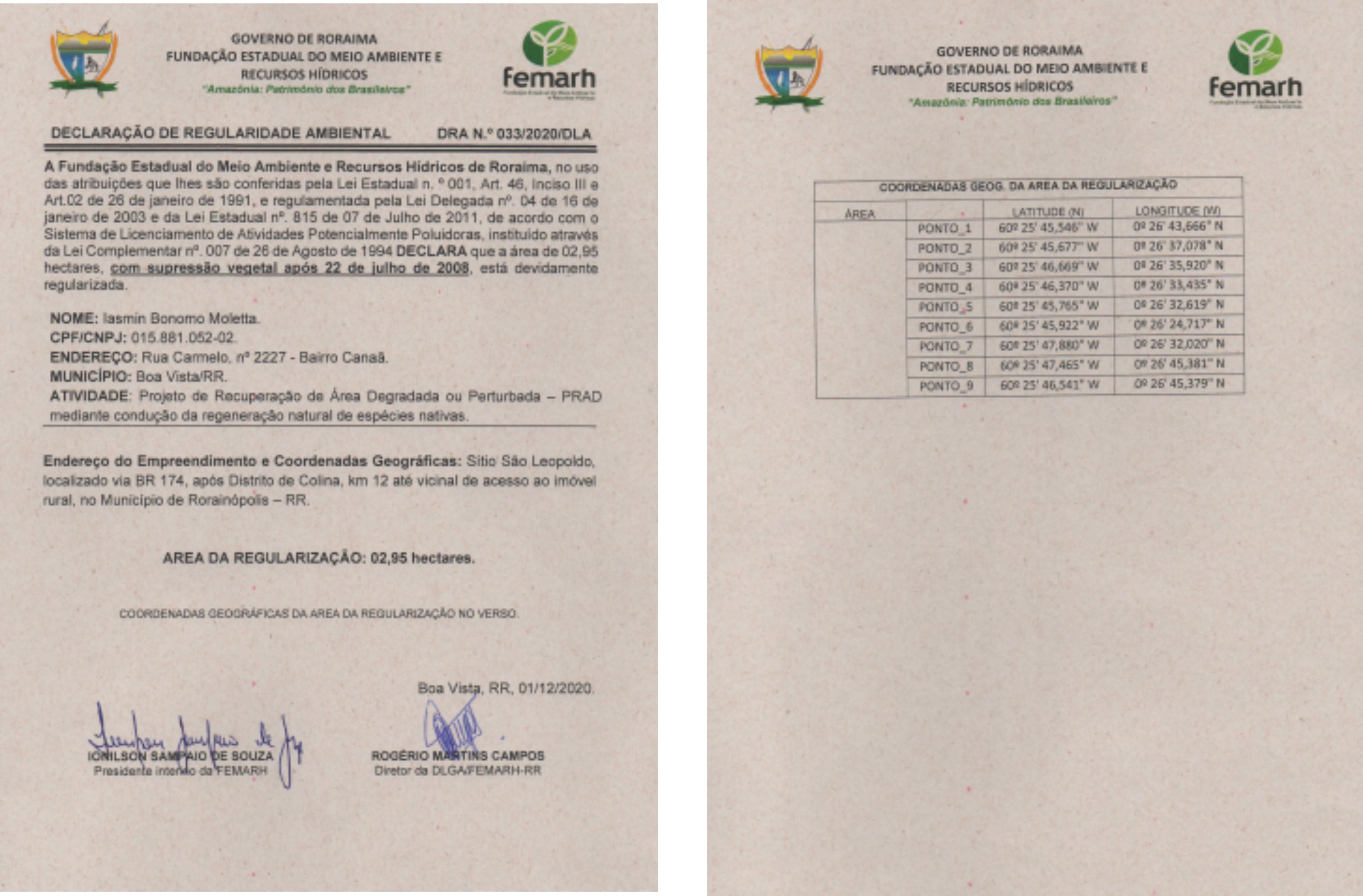 Declaração de Regularidade Ambiental - DRA Nº 033/2020/DLA
