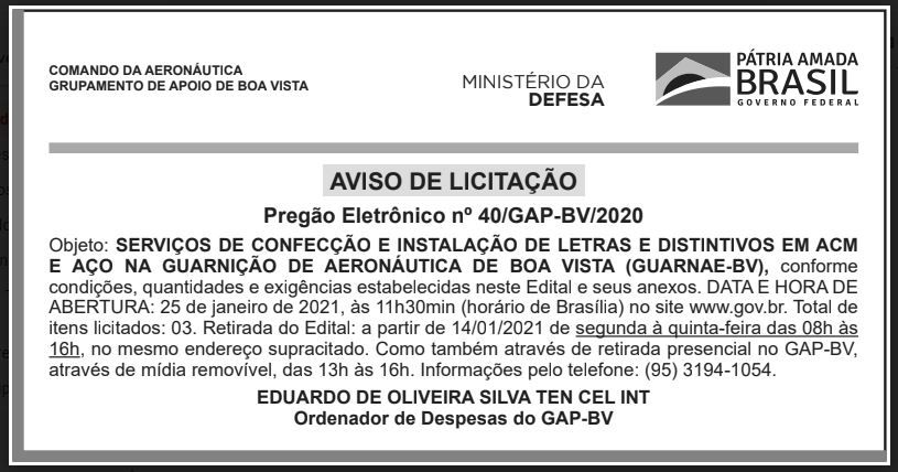 Aviso de Licitação - Pregão Eletrônico no 40/GAP-BV/2020