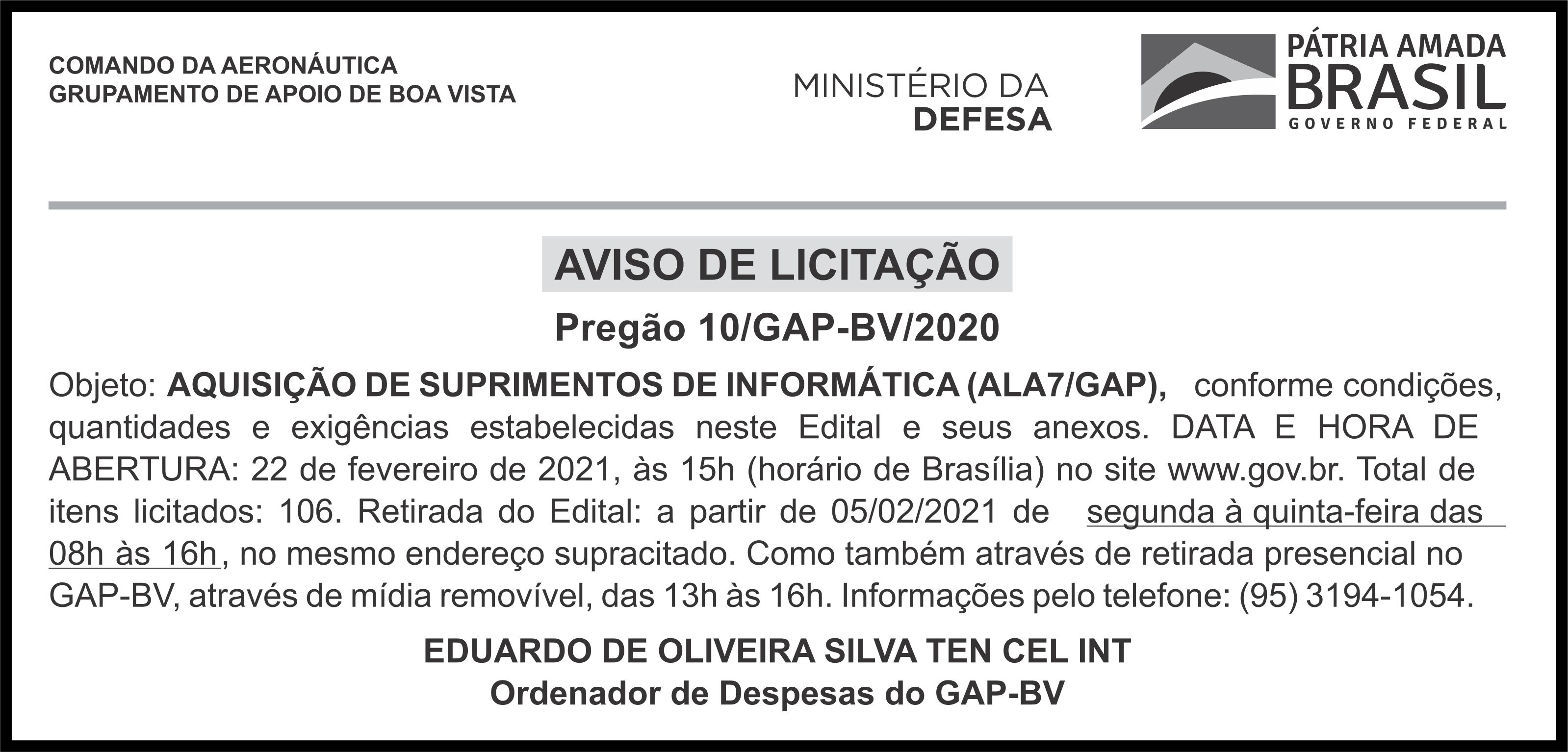AVISO DE LICITAÇÃO - PREGÃO Nº 10/GAP-BV/2020