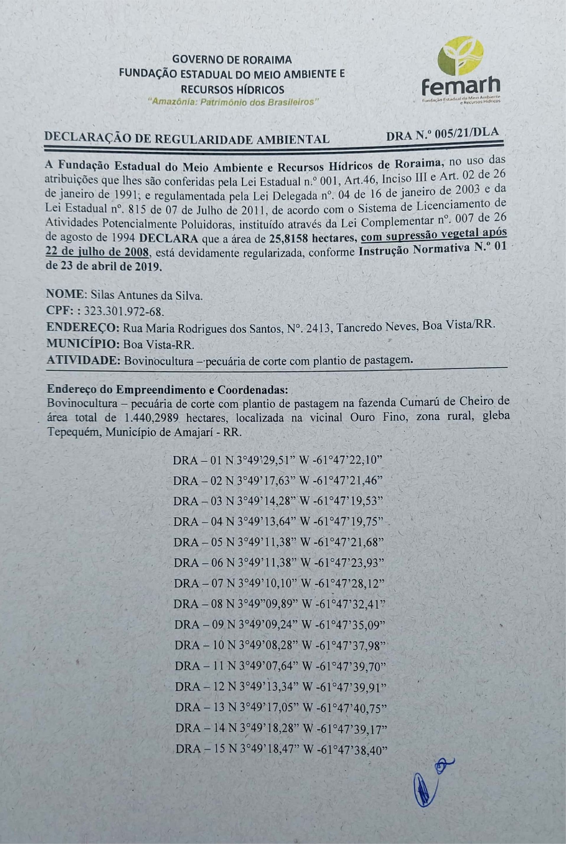 Declaração de Regularidade Ambiental - DRA Nº 005/21/DLA