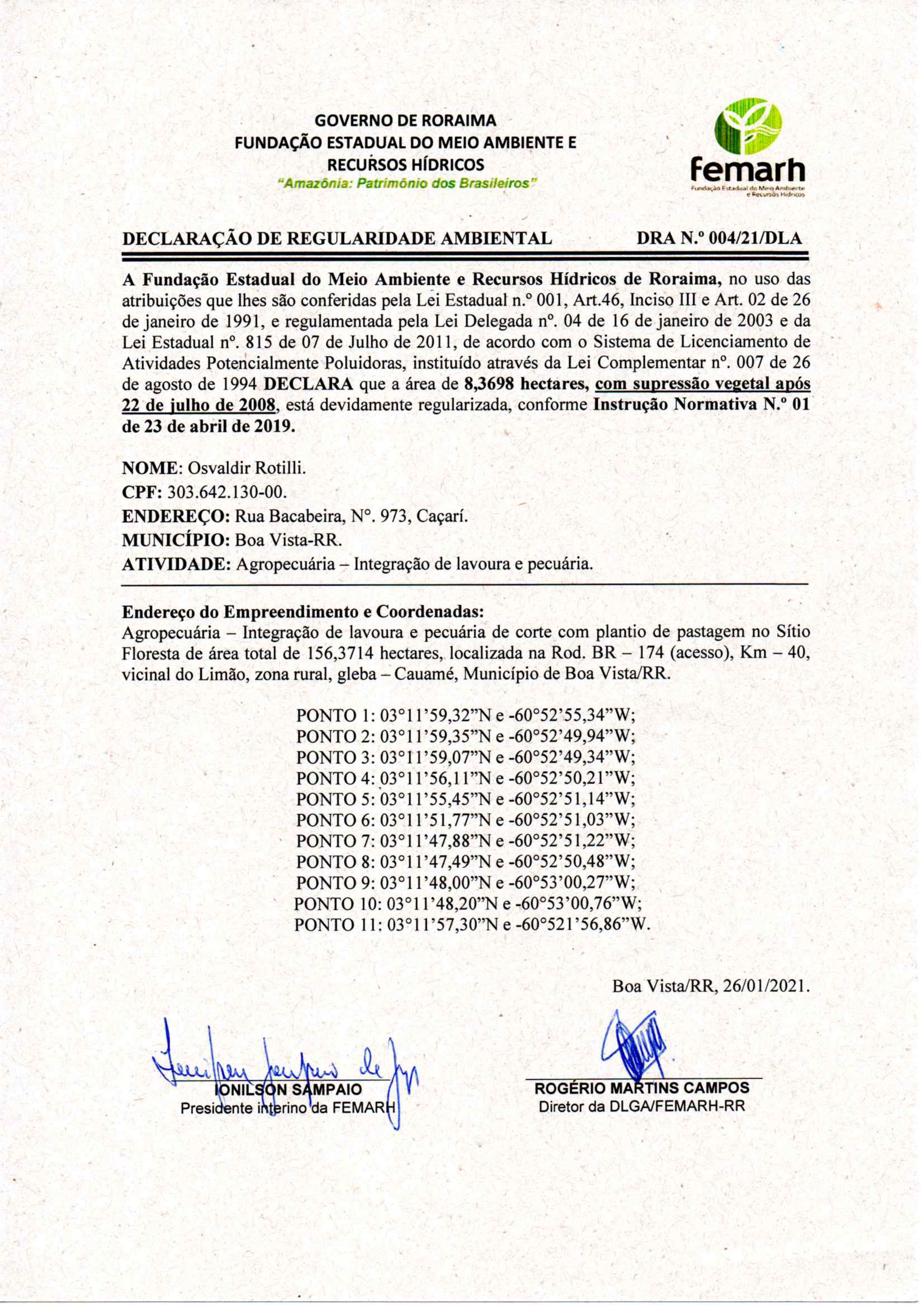 Declaração de Regularidade Ambiental - DRA Nº 004/21/DLA