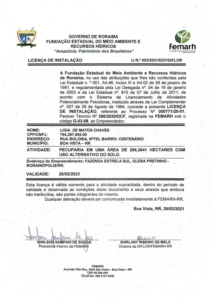 Licença de Instalação Nº LI 002/2021/DCF/DIFLOR