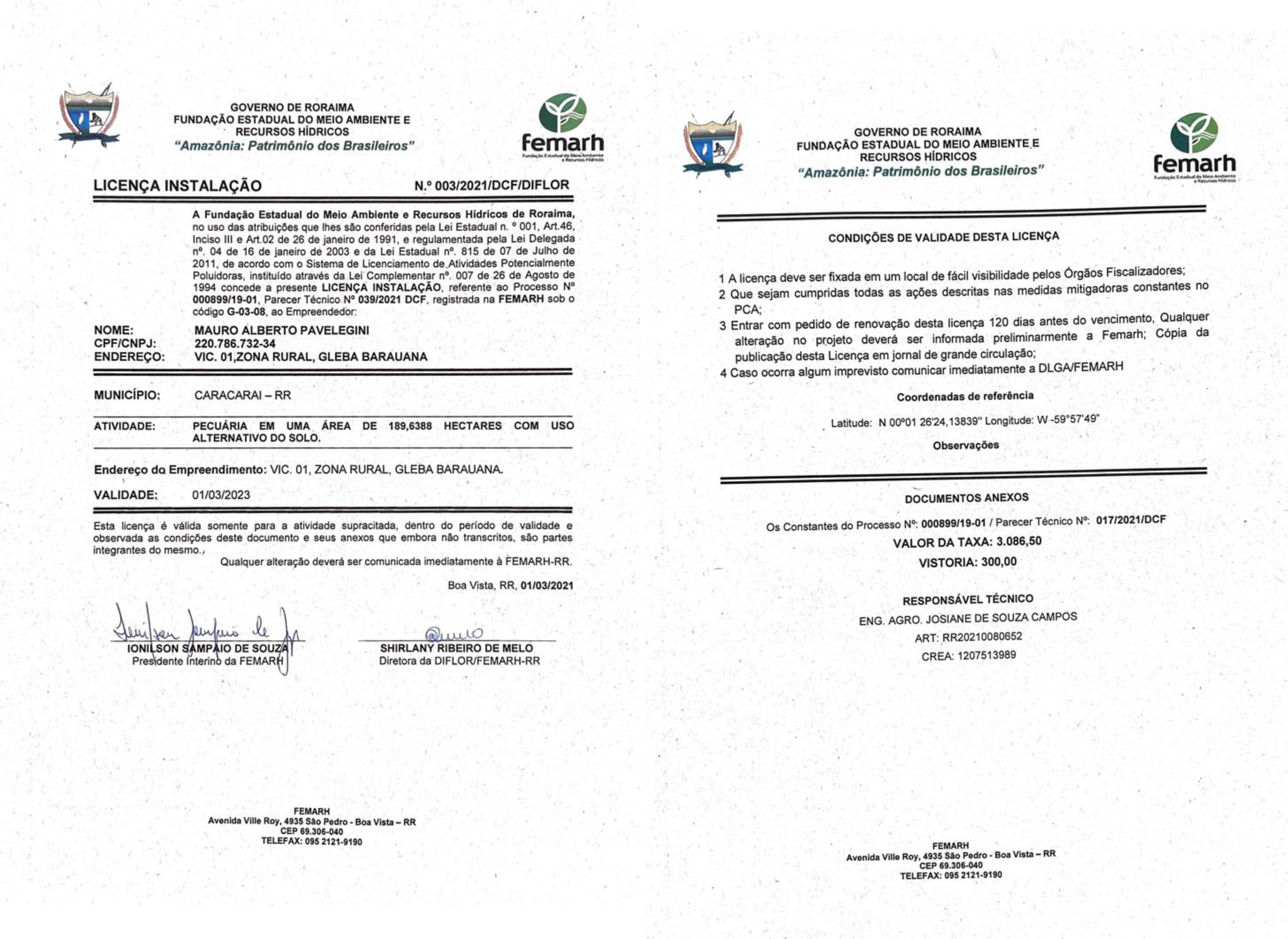 Licença de Instalação Nº LI 003/2021/DCF/DIFLOR