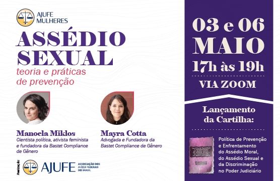 A Comissão Ajufe Mulheres, grupo da Associação dos Juízes Federais do Brasil (Ajufe) composto por magistradas e magistrados federais, realiza nos dias 3 e 6 de maio, das 17 às 19h no horário de Brasília (16 às 18h no horário de Manaus), um curso com dois encontros para debater "Assédio sexual: teoria e práticas de prevenção". As inscrições estão abertas pelo link: https://bit.ly/3uJuo4w.