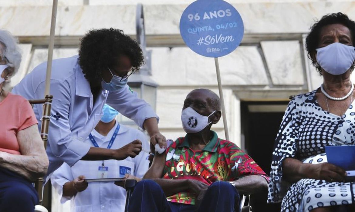 Nelson Sargento faz acompanhamento no Inca desde 2005, quando foi diagnosticado com um câncer de próstata, já tratado. No dia 26 de fevereiro, o compositor da Mangueira recebeu a segunda dose da vacina contra a covid-19 em casa (foto).