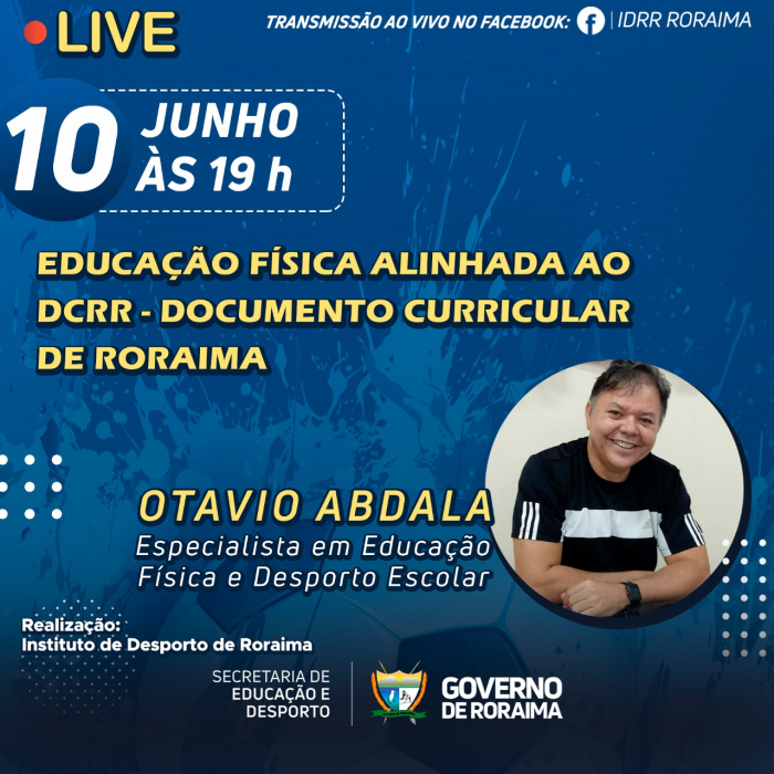 A live desta semana vai abordar as especificidades da disciplina de Educação Física dentro do DCRR, documento construído à luz das diretrizes da BNCC (Base Nacional Comum Curricular), que direciona as políticas públicas educacionais e o currículo a ser ministrado em todas as escolas das redes estadual e municipal, tendo como foco os direitos de aprendizagem e desenvolvimento como garantia da formação integral do aluno.