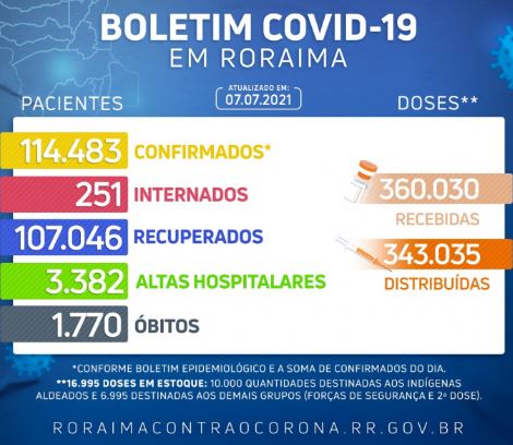 Além disso, 107.046 pacientes diagnosticados com a doença receberam alta de isolamento e encontram-se recuperados. Deste total, 1.345 em Alto Alegre, 991 em Amajari, 82.137 são de Boa Vista, 2.208 de Bonfim, 2.103 no Cantá, 2.403 em Caracaraí, 1.835 em Caroebe, 1.073 em Iracema, 2.047 em Mucajaí, 447 em Normandia, 2.158 em Pacaraima, 2.870 em Rorainópolis, 1.352 em São João da Baliza, 351 de São Luiz e 1.142 em Uiramutã.