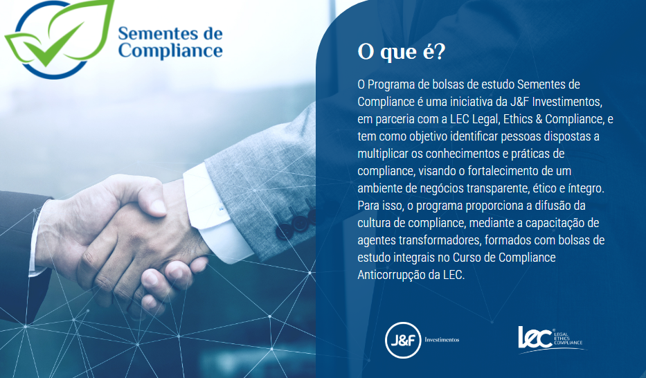 A J&F Investimentos, em parceria com a Legal, Ethics & Compliance (LEC) oferece 32 bolsas de estudo do “Curso de Compliance Anticorrupção”, que desenvolve competências para implementar ou gerir um programa, além de preparar para o exame de Certificação Profissional em Compliance Anticorrupção (CPC-A).