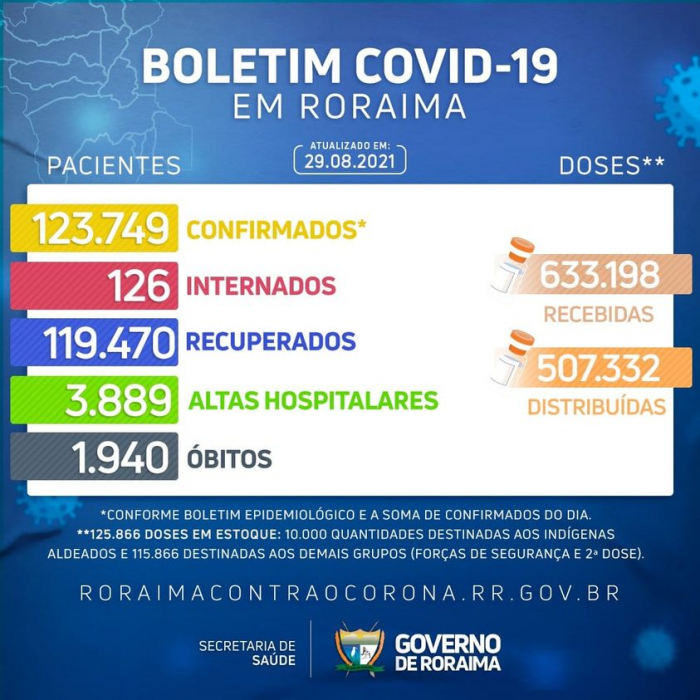 Além disso, 119.470 pacientes diagnosticados com a doença receberam alta de isolamento e encontram-se recuperados. Deste total, 1.515 em Alto Alegre, 1.135 em Amajari, 92.334 são de Boa Vista, 2.424 de Bonfim, 2.377 no Cantá, 2.595 em Caracaraí, 1.941 em Caroebe, 1.200 em Iracema, 2.224 em Mucajaí, 473 em Normandia, 2.252 em Pacaraima, 3.184 em Rorainópolis, 1.552 em São João da Baliza, 464 de São Luiz e 1.165 em Uiramutã.