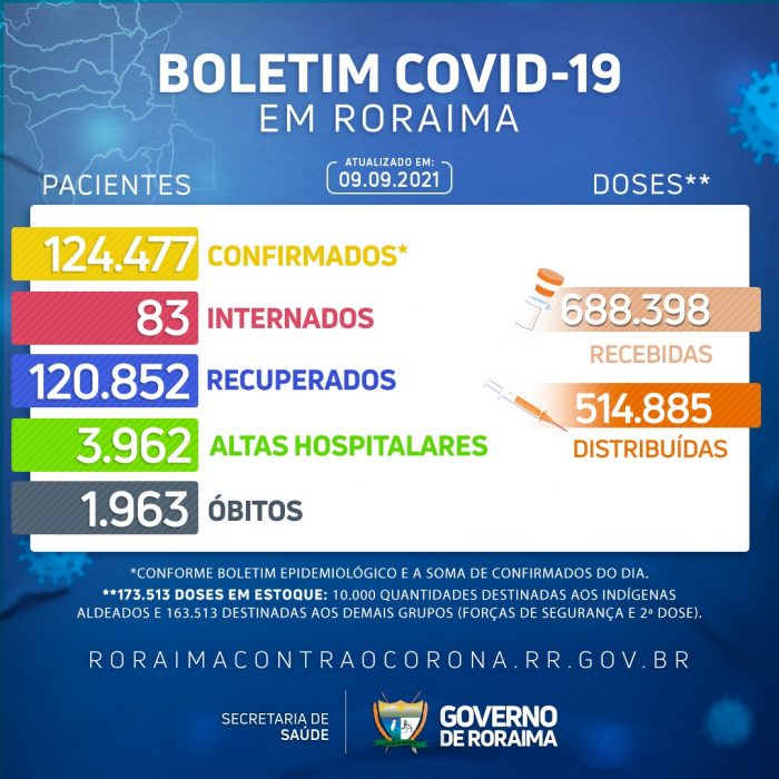 Além disso, 120.852 pacientes diagnosticados com a doença receberam alta de isolamento e encontram-se recuperados. Deste total, 1.542 em Alto Alegre, 1.142 em Amajari, 93.318 são de Boa Vista, 2.450 de Bonfim, 2.407 no Cantá, 2.627 em Caracaraí, 1.956 em Caroebe, 1.246 em Iracema, 2.261 em Mucajaí, 496 em Normandia, 2.277 em Pacaraima, 3.246 em Rorainópolis, 1.591 em São João da Baliza, 484 de São Luiz e 1.165 em Uiramutã.