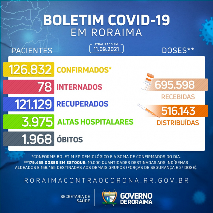 Além disso, 121.129 pacientes diagnosticados com a doença receberam alta de isolamento e encontram-se recuperados. Deste total, 1.548 em Alto Alegre, 1.143 em Amajari, 93.527 são de Boa Vista, 2.452 de Bonfim, 2.408 no Cantá, 2.630 em Caracaraí, 1.961 em Caroebe, 1.246 em Iracema, 2.267 em Mucajaí, 510 em Normandia, 2.284 em Pacaraima, 3.261 em Rorainópolis, 1.598 em São João da Baliza, 484 de São Luiz e 1.165 em Uiramutã.