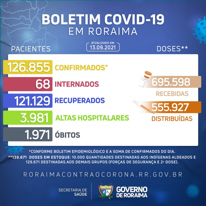 Além disso, 121.129 pacientes diagnosticados com a doença receberam alta de isolamento e encontram-se recuperados. Deste total, 1.548 em Alto Alegre, 1.143 em Amajari, 93.527 são de Boa Vista, 2.452 de Bonfim, 2.408 no Cantá, 2.630 em Caracaraí, 1.961 em Caroebe, 1.246 em Iracema, 2.267 em Mucajaí, 510 em Normandia, 2.284 em Pacaraima, 3.261 em Rorainópolis, 1.598 em São João da Baliza, 484 de São Luiz e 1.165 em Uiramutã.