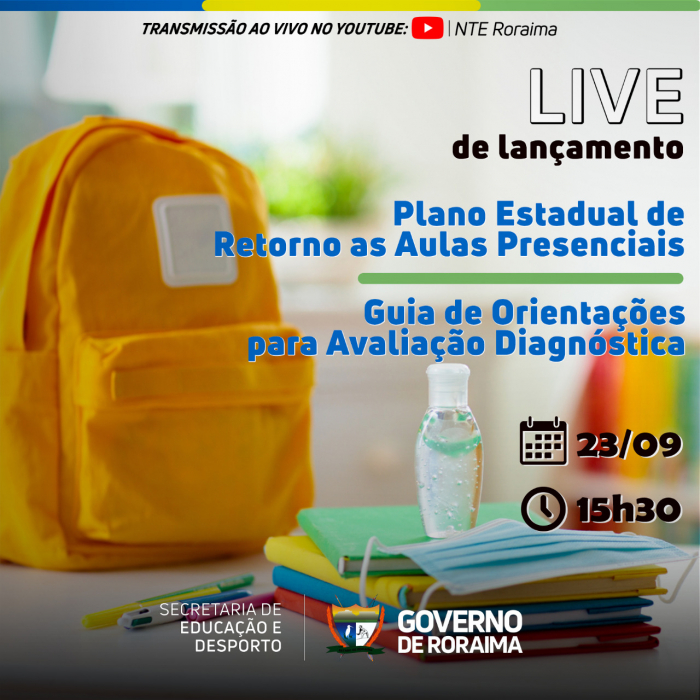 Nesta quinta-feira, 23, a Secretaria de Educação e Desporto, lança oficialmente o Plano Estadual de Retorno às aulas presenciais, e o Guia de Orientação para Avaliação Diagnóstica. O lançamento será feito por meio de uma Live no Youtube, no canal NTE Roraima, a partir das 15h30.