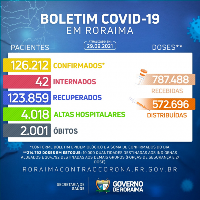 Além disso, 123.859 pacientes diagnosticados com a doença receberam alta de isolamento e encontram-se recuperados. Deste total, 1.551 em Alto Alegre, 1.144 em Amajari, 93.866 são de Boa Vista, 2.457 de Bonfim, 2.413 no Cantá, 2.632 em Caracaraí, 1.964 em Caroebe, 1.347 em Iracema, 2.277 em Mucajaí, 519 em Normandia, 2.293 em Pacaraima, 3.279 em Rorainópolis, 1.610 em São João da Baliza, 484 de São Luiz e 1.165 em Uiramutã.