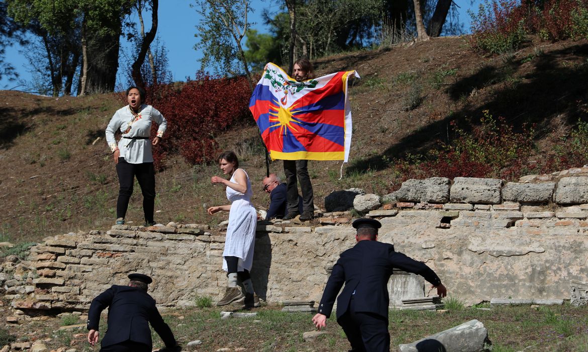 Ativistas dos direitos humanos desenrolaram uma bandeira que dizia "Não aos Jogos Genocidas", agitaram a bandeira tibetana e pediram um boicote à Olimpíada de Inverno de Pequim de 2022 durante a cerimônia de acendimento da tocha nesta segunda-feira (18).