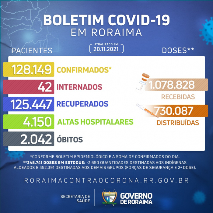 A divulgação da situação epidemiológica com relação à doença faz parte do Plano de Contingenciamento montado pelas autoridades de saúde do Estado. As publicações vão ocorrer diariamente no site da Sesau (https://www.google.com/url?q=http://www.saude.rr.gov.br&source=gmail&ust=1637533934524000&usg=AOvVaw1x1BiZHQJ_bzhNVDpqD86s">www.saude.rr.gov.br) e no portal https://www.google.com/url?q=http://roraimacontraocorona.rr.gov.br&source=gmail&ust=1637533934524000&usg=AOvVaw1nlWzxLajZ5QGxwvIyCvu_">roraimacontraocorona.rr.gov.br.