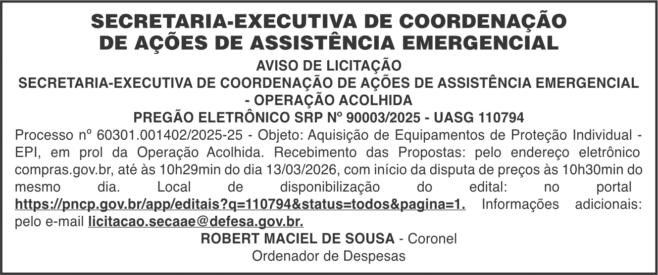 Aviso de Licitação – Secretaria-Executiva de Coordenação de Ações de Assistência Emergencial – Operação Acolhida – Pregão Eletrônico SRP Nº. 90003/2025