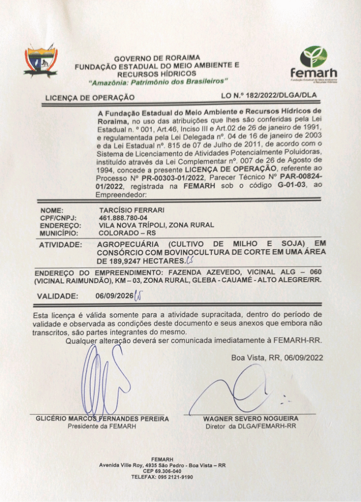 Licença de Operação – LO Nº 182/2022/DLGA/DLA