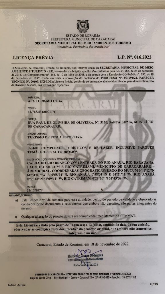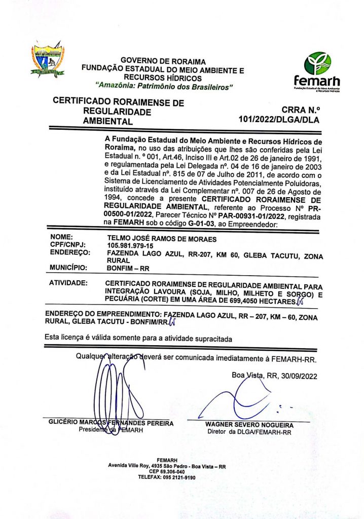 Certificado Roraimense de Regularidade Ambiental – CRRA Nº 101/2022/DLGA/DLA