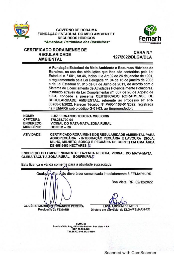 Certificado Roraimense de Regularidade Ambiental – CRRA Nº 127/2022/DLGA/DLA