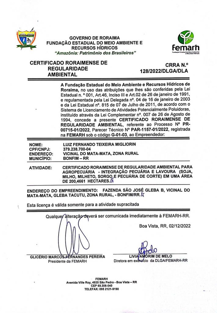 Certificado Roraimense de Regularidade Ambiental – CRRA Nº 128/2022/DLGA/DLA