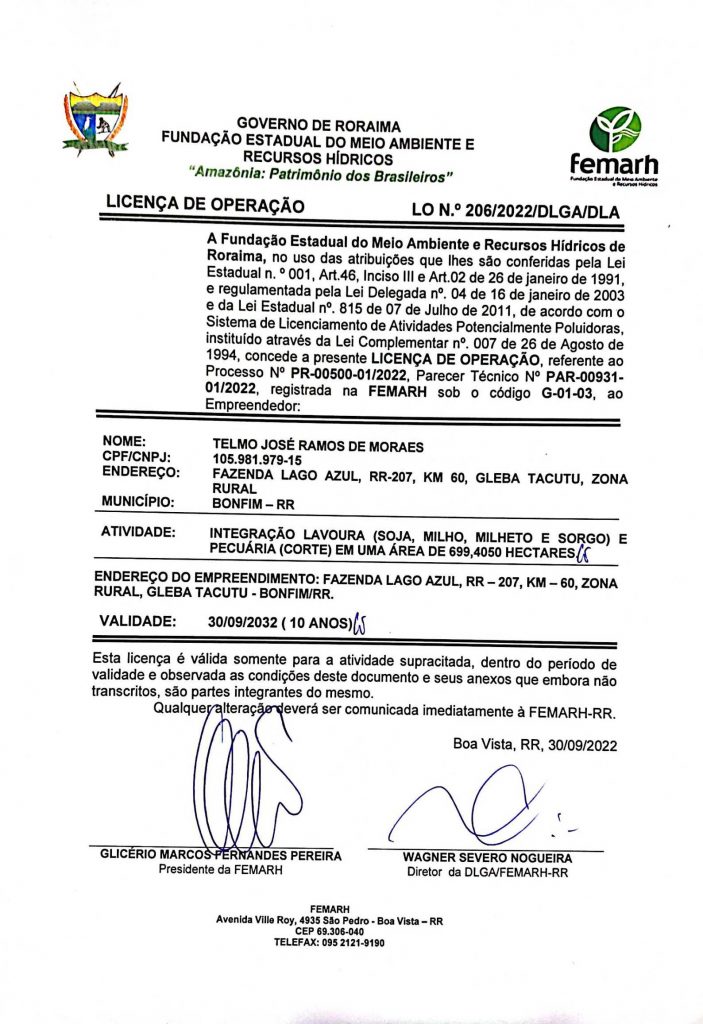 Licença de Operação – LO Nº. 206/2022/DLGA/DLA