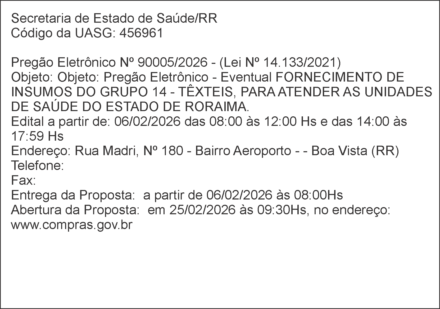 Secretaria de Estado de Saúde/RR Código da UASG: 456961 Pregão Eletrônico Nº 90005/2026