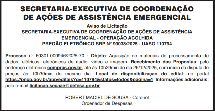 SECRETARIA-EXECUTIVA DE COORDENAÇÃO DE AÇÕES DE ASSISTÊNCIA EMERGENCIAL – PREGÃO ELETRÔNICO SRP Nº 90038/2025 – UASG 110794