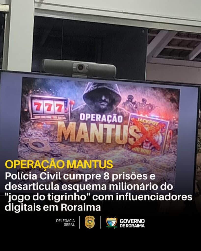 A PCRR (Polícia Civil de Roraima) deflagrou nas primeiras horas desta segunda‑feira, 27, a Operação Mantus, que resultou no cumprimento de oito mandados de prisão preventiva, sendo sete em Roraima e um no estado de Goiás.