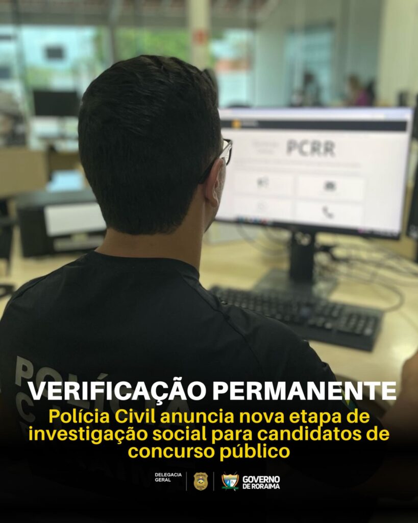 Todos os candidatos aprovados no concurso público da PCRR (Polícia Civil de Roraima), inclusive os já avaliados e os que estão no cadastro de reserva, passarão por uma nova etapa de investigação social. A medida foi anunciada nesta sexta‑feira, dia 17, por meio de comunicado conjunto da Segad (Secretaria de Estado da Gestão Estratégica e Administração) e da Delegacia‑Geral da Polícia Civil.